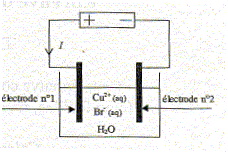 L'intensité est constante I= 2,4 A ; les deux électrodes de graphite sont chimiquement inertes ; elles plongent dans 1 L de solution de bromure de cuivre CuBr2 de concentration en soluté apporté c= 0,10 mol/L. On met en évidence un dépot de cuivre sur l'une des électrodes et la formation de dibrome au niveau de l'autre électrode.