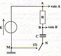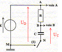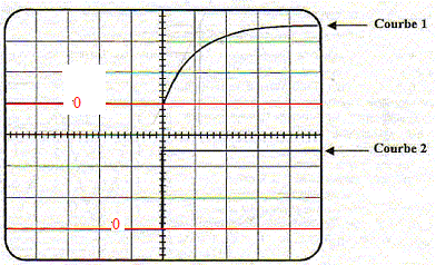 La tension aux bornes du condensateur en charge à travers un résistor est croissante de 0 à E= 5 V : courbe 1( voie B). La tension aux bornes du dipole "RC" est constante, égale à E =5 V: courbe 2 ( voie A) Relation entre la tension E et les tensions uR aux bornes du conducteur ohmique et uC aux bornes du condensateur. E= uR+uC,