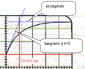 uC. Déterminons A et B : A l'instant initial t=0, le condensateur n'est pas chargé et uC(0)=0 = A+ B. A un instant suffisamment long, le condensateur est chargé et uC(oo) = E= A ; par suite B= -E. uC(t) = E(1- exp(-t/t)). La constante de temps est t = RC. Montrons par analyse dimensionnelle que t a la dimension d'un temps. R : tension / intensité ; C : charge / tension soit intensité * temps / tension par suite RC a la dimension d'un temps.