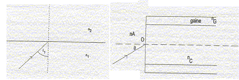 Les trois rayons incident, réfléchi et réfracté sont dans le même plan ; l'angle d'incidence i1 est égal à l'angle de réflexion r. Les angles d'incidence i1 et réfracté i2 sont reliés par la relation : n1 sin i1 = n2 sin i2. Condition sur i1, pour que seul le rayon réfléchi existe : sin i2 = n1 /n2 sin i1 ; sin 90 = n1 /n2 sin i1 lim ; 1 = n1 /n2 sin i1 lim ; sin i1 lim = n2 /n1. Si sin i1 est supérieur à n2 /n1 , il y a réflexion totale. ( le rayon réfracté n'existe pas ) sin i1 lim = 1,47/1,5 =0,98 ; i1 lim = 78,5°.