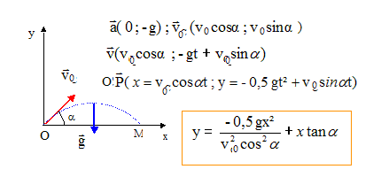 Evolution temporelle des coordonnées du vecteur vitesse puis l'évolution des coordonnées du projectile : Le mouvement est dans le plan défini par les vaecteurs vitesse initiale et accélération : z(t) = 0 ; v(t) = 0.