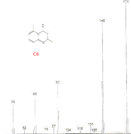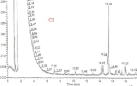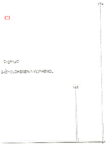 Le pic dont le temps de rétention est 15,46 min est représenté sur le document C2. Des spectres de composés témoins sont donnés C3 à C7.
