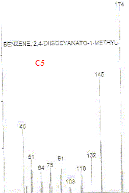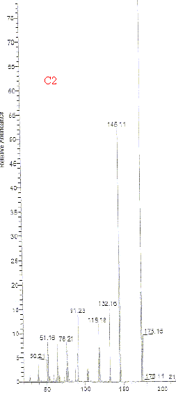 Son principe : séparation en phase gazeuse de molécules chargées d'après leur rapport masse/charge (m/z). L'impact électronique fourni de nombreux fragments et le spectre compte un très grand nombre de raies. On identifie un composé en comparant son spectre de masse à des banques de spectres de masse de composés connus. On peut identifier C2 à C5 : les spectres correspondants présentants de grandes analogies. Formule semi-développée correspondant à C3 :