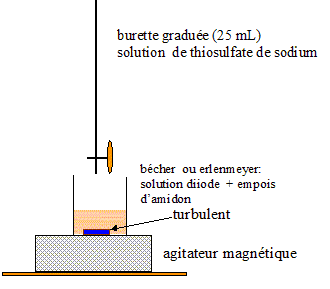 Principe de la manipulation : L'acétone réagit avec le diiode en milieu basique selon la réaction d'équation : CH3-CO-CH3(aq) + 3 I2(aq) + 4 HO-(aq) = CH3-COO-(aq) + 3H2O(l) + CHI3(s) + 3I-(aq) On travaille avec un excès de diiode. Après avoir acidifié le milieu, le diiode n'ayant pas réagi est dosé par les ions thiosulfate en présence d'empois d'amidon. Mode opératoire : Dans un erlenmeyer on verse V= 10,0 mL de la solution d'acétone, V1 = 20,0 mL d'une solution de diiode de concentration molaire volumique c1 = 1,00 10-1 mol/L et 5 mL d'une solution aqueuse d'hydroxyde de sodium à 5 mol/L. On bouche l'erlenmeyer et on agite pendant quelques minutes. Il se forme alors un précipité jaune de triiodométhane CHI3(s).