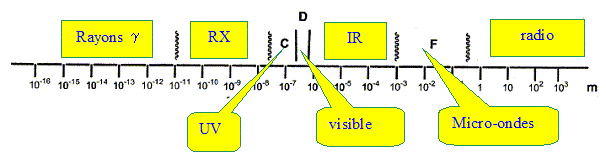 Mesures physiques : Dans l'échelle de longueur d'onde suivante, indiquer les différents domaines : Visible ; RX ; radio ; micro-ondes ; rayons g ; UV; IR.