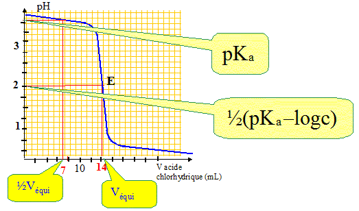 0 l'équivalence on a une solution d'acide lactique, acide peu ionisé : pH= ½(pKa - log c) pH= 0,5(3,9 - log 0,72) = 2,0. - Concentration c de la solution de lactate de sodium si le volume équivalent vaut 14,3 mL ? A l'équivalence les quantités de matière des réactifs mis en présence sont en proportions stoechiométriques : Vlactate c = Véqui Cacide ; c = Véqui Cacide/ Vlactate = 1*14,3/20 = 0,72 mol/L.