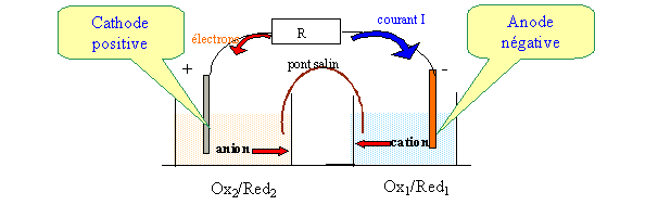 Indiquer les réactions aux électrodes, la réaction globale, le parcours des électrons et le sens de circulation du courant : Oxydation à l'anode : couple oxydant /réducteur : Ox1/red1 : red1 = Ox1 + n1 e-. Des électrons sont libérés, l'anode constitue le pôle négatif de la pile. Réduction à la cathode : couple oxydant /réducteur : Ox2/red2 : Ox2 + n2 e- = Red2. Bilan : n2 fois { red1 = Ox1 + n1 e-} n1 fois { Ox2 + n2 e- = Red2} n2 red1 + n1 Ox2 = n2 Ox1 + n1 Red2. Quel est le rôle de l'électrolyte : L'électrolyte assure la conduction électrique en solution : double migration des ions ( les ions positifs se déplacent dans le sens du courant ; les ions négatifs se déplacent en sens contraire ).