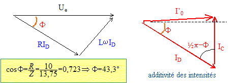 Calculer les intensités efficaces, Id dans le dipôle, IC dans le condensateur et I'0 dans la ligne. Id = Ue/ZD = 220/13,75 = 16 A Impédance du condensateur : ZC= 1/(Cw) ; IC= Ue/ZC = UeCw IC =220*130,4 10-6*314 = 9,0 A