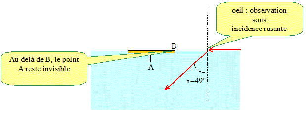 loi de Descartes : 1 = 1,33 sin r soit r = 48,75° De plus tan r = d/h ; tan 48,75 = 1,140 ; d= h tan r = 5*1,14 = 5,7 cm. L'observateur situé à une distance inférieure à 5,7 cm du centre du disque "transparent" peut voir le point A.