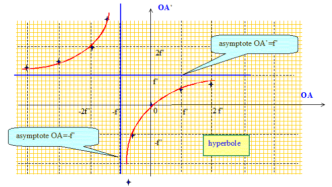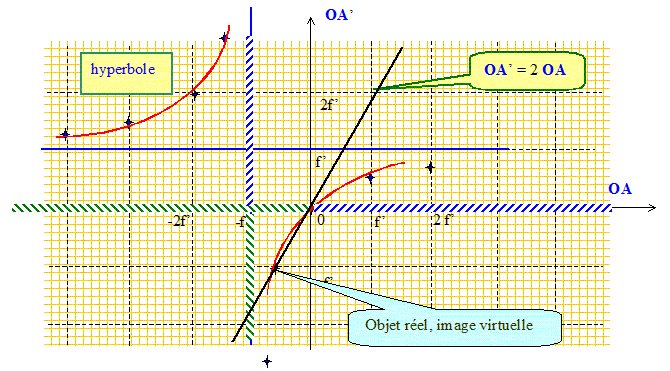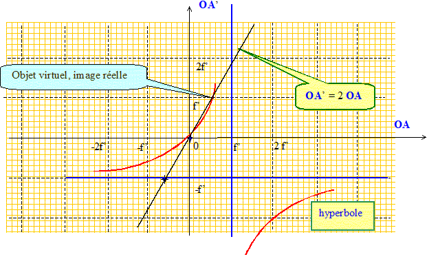 Soit une lentille mince convergente de centre O. On note F et F' ses foyers objet et image respectifs. Préciser le signe de OF'. Pour une lentille convergente la distance focale image OF' est positive ( F' à droite de O). Donner la relation de conjugaison avec origine aux sommet pour un couple de points conjugués sur l'axe optique A et A'. 1/OF' = 1/OA' - 1/OA. On cherche à traduire la relation de conjugaison par une courbe dans le plan ( OA ; OA' ) où l'abscisse est OA et l'ordonnée OA'. Où se situe l'image d'un objet ponctuel placé au foyer principal objet F ? 1/OA = -1/OF' La relation de conjugaison conduit à 1/OA' =0, c'est à dire une image rejetée à l'infini. Où se situe l'image d'un objet ponctuel qui serait à l'infini sur l'axe ? L'image d'un objet réel situé à l'infini sur l'axe se trouve au foyer principal image. En déduire que le graphe que l'on recherche admet deux asymptotes que l'on caractérisera. Tracer la relation de conjugaison. Quel type de courbe reconnaissez vous ? Quelques valeurs : ( f' : distance focale image )