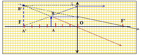 Rappeller les propriétés des rayons tracés. Un rayon issu de B : -passant par le centre optique O n'est pas dévié. - parallèle à l'axe optique, émerge en passant par F'. - passant par F, émerge parallèlement à l'axe optique. Que devient ce graphique et l'étude précédente pour une lentille divergente ? La distance focale image d'une lentille divergente est négative.