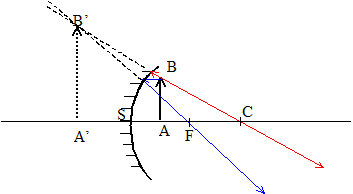 miroir concave convergent Caractéristiques de l'image A'B' d'un objet AB réel mesurant 1 cm, situé à 1 m du sommet, donnée par un miroir sphérique concave ( R=4 m) (
