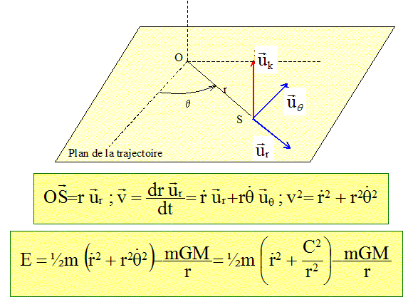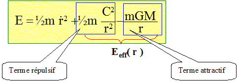 Expression de l'énergie mécanique du satellite. L'énergie mécanique E est la somme de l'énergie cinétique et de l'énergie potentielle.