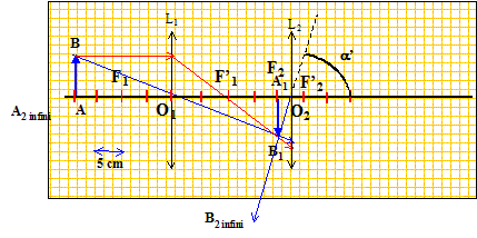 On suppose l'oeil placé contre la lentille L2. Même calcul que ci-dessus. L'oeil accomode au maximum : l'image définitive virtuelle A2B2 est à 12,5 cm à gauche de F'2. O2A2 = -12,5 cm = -0,125 m. Appliquer la formule de conjugaison à la lentille L2. 1/O2F'2 = 1/O2A2 - 1/O2A1. 1/O2A1 = 1/O2A2-1/f'2 = 1/(-0,125) - 1/0,02 = -8-50 = -58 ; O2A1 = -1/58 =-0,01724 m = -1,72 cm. O1A1 = O1O2 +O2 A1=22-1,724 = =20,276 cm = 0,2028 m. Appliquer la formule de conjugaison à la lentille L1. 1/O1F'1 = 1/O1A1 - 1/O1A. 1/O1A = 1/O1A1-1/f'1 = 1/0,2028- 1/0,1 =4,932-10 = -5,068 ; O1A = -1/5,068 =-0,1973 m = -19,7 cm. |