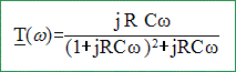 Déterminer la fonction de transfert T(w) = Us/Ue. admittance complexe de R et C en parallèle : Y = 1/R + jCw. impédance complexe : Z =1/Y =1/(1/R+jCw) = R/(1+jRCw). impédance complexe de l'ensemble : Z1 = R+1/(jCw) + Z .