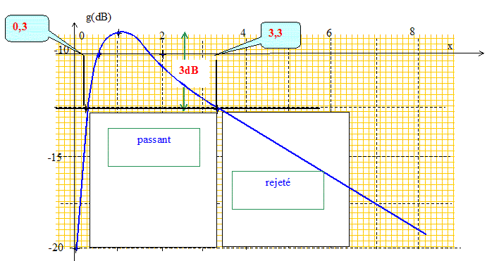 Calculer les fréquences de coupure et la largeur de la bande passante. Les fréquences de coupures ( à 3 dB) sont telles que : T = Tmax / 2½ ou T2 = ½ T2max = 1/18. soit T2= x2 [1 +7x 2+x4 ]-1 = 1/18 18x2 = 1 +7x 2+x4 ; 1-11x 2+x4=0 Changement de variable : X= x2 ; 1-11X + X2=0 D =121-4 = 117 ; D½ =10,816 X1 = (11-10,816) /2 = 0,0916 ; X2 = (11+10,816) /2 = 10,908. x1 =3,30 ; x2 =0,30. f1 = 3,30 f0 ; f2 = 0,30 f0 ; Df =f1- f2 = 3 f0. Tracer le diagramme de Bode en gain, en phase. T = [1/x2 +7+ x2 ]-½. Il faut représenter la fonction : g(dB) = 20 log T = -10 log (1/x2 +7+x2)