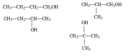CH3-CH2-CH2-CH2OH : butan-1-ol. CH3-CH2-CH(OH)-CH3 : butan-2-ol. (CH3)2CH-CH2OH : 2-méthylpropan-1-ol (CH3)3C-OH : 2-méthylpropan-2-ol