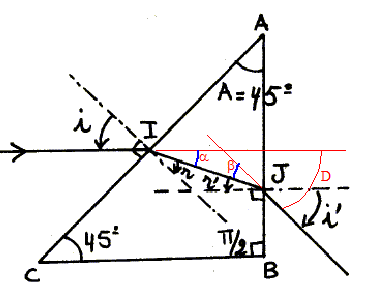 Déterminer l'angle d'incidence i et l'angle de réfraction r au point I. i = 45° ; nair sin i = n sin r ; sin r = sin 45/2½ =0,5 ; r = 30°. Calculer l'angle d'incidence r' au point J. r+r'=A soit r' = 45-30 = 15°. Exprimer l'angle de déviation D en fonction de i'.