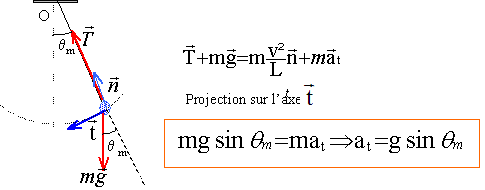 Calculer L : période du pendule : T= 2p (L/g)½ ; T2 = 4 p2 L/g ; L = T2 g/( 4 p2 ) avec T= 2 s L= 4*10/(4*10) = 1 m. Calculer l'accélération normale aN au point A : En A la vitesse est nulle ; de plus aN= v2/ L. En A l'accélération normale est nulle. Exprimer l'accélération tangentielle aT en fonction de g, qm au point A .