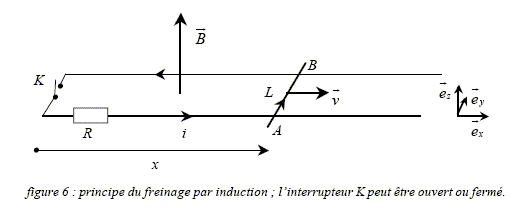Le circuit est ouvert. On suppose dans un premier temps que l'interrupteur K est ouvert. Valeur de l'intensité i du courant dans le circuit : Si le circuit est ouvert, aucun courant électrique ne peut circuler et en conséquence i=0. Expression de la force électromagnétique F qui s'exerce sur la barre AB. La force de Laplace est proportionnelle à l'intensité du courant. L'intensité du courant étant nulle, alors la force électromagnétique est nulle : F=0. Quel sera alors le mouvement de la barre ? Le freinage est-il possible ? En absence de frottement la barre AB est pseudo-isolée. D'après le principe d'inertie, celle-ci est animée d'un mouvement rectiligne uniforme. Le freinage est impossible.