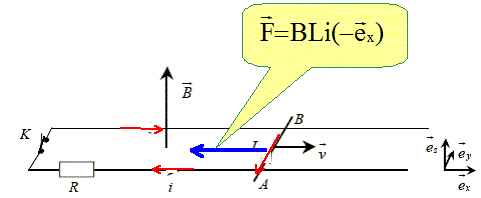 On ferme l'interrupteur K à la date t=0. On souhaite étudier la conséquence du phénomène d'induction électromagnétique dans le circuit. Montrons que la fem d'induction induite par le déplacement de la barre dans le champ magnétique vaut e=-BLv : La fem induite est donnée par la loi de Faraday : e = -dF / dt. où F =BS est le flux du champ magnétique B à travers la surface S du circuit. Expression de la surface S du circuit en fonction de l'abscisse x de la barre et de sa longueur L. S= x L. Expression de la fem induite e en fonction de B, L et v = dx/dt la vitesse de la barre. F =BS = BLx e = -dF / dt = -BL dx/dt ; e = -B l v. En déduire l'expression de l'intensité i du courant électrique dans le circuit. Quel est le signe de i ? e = R i ; i = e/ R ; i = -Blv/R Le signe moins indique que le courant a le sens contraire au sens choisi sur le schéma. On parlera de
