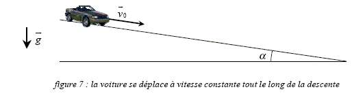 Variation d'énergie cinétique dEc de la voiture pendant dt. La vitesse étant constante, l'énergie cinétique ne varie pas : dEc =0. Déterminons la variation d'altitude dh de la voiture au cours de ce déplacement dx. sin a = dh/dx, a étant petit sin a voisin a radian et dh = a dx. Variation d'énergie potentielle dEp de la voiture pendant dt. L'origine de l'énergie potentielle de pesanteur est prise en bas de la descente. Lors de la descente l'énergie potentielle diminue dEp = mg (-dh) = -mg a dx avec dx = v0 dt dEp = -mg a v0 dt. Variation dEm de l'énergie mécaniue de la voiture. dEm = dEc + dEp = 0 + ( -mg a v0 dt) Puissance mécanique réçue par la voiture. Pm = dEm/dt = -mg a v0 Interprétons le signe de la puissance. Le signe négatif traduit la conversion de l'énergie mécanique en énergie électrique.