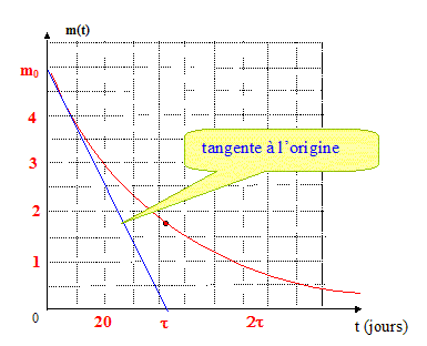 Attention aux fuites ! Les fuites sont inévitables, la molécule H2 étant la plus petite qui existe. Les constructeurs impose un taux de fuite de dihydrogène maximal de 1,0 g de H2 par kg de H2 stocké et par heure. Expression du taux de fuite , noté a, en s-1 : 1,0 10-3 kg perdu par kg en stock en 3600 s soit a= 10-3 / 3600 = 2,8 10-7 s-1 ( 2,777 ) Variation de masse du réservoir : Entre les instants très proches dt et t+dt, la masse du réservoir diminue d'une quantité très petite notée dm : On note m(t) la masse de dihydrogène contenue dans le résevoir à la date t. A chaque seconde la masse de H2 diminue de -a m kg ( le signe moins traduit le mot "diminue" ) soit en dt seconde une diminution de : dm = - -a m(t) dt. Equation différentielle du premier ordre vérifiée par m(t) : dm/dt = - a m(t) soit dm/dt + a m(t) =0 (1) Montrons que m(t) = m0 exp(-t/t) est solution de cette équation : dm/dt = -m0/t exp(-t/t) ; repport dans (1) : -m0/t exp(-t/t) + am0exp(-t/t) = 0 Cette égalité est vérifiée quel que soit le temps si : t = 1/a. t = 1/ 2,777 10-7 = 3,6 106 s = 42 jours. t est le temps de fuite caractéristique du réservoir ; au bout de 5 t voisin de 200 jours, le réservoir est vide du fait des fuites. Allure de la courbe m(t) :