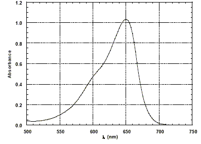 Le solide, sous la forme de très petite particules, est mis en suspension dans la solution à traiter. L'absorption de la lumière par ce semi-conducteur entraîne l'excitation d'un électron qui peut ainsi se déplacer dans le solide et permettre à des réactions d'oxydoréduction de se produire avec les molécules organiques adsorbées à la surface de la particule. Le bilan de ce processus complexe est en fait une oxydation des molécules organiques par le dioxygène présent en solution. La photo-décomposition d'une substance organique est considérée complète si les produits de la réaction sont CO2, NO3-, SO42- et H2O, selon la nature des éléments chimiques contenus dans la molécule organique de départ. On parle alors de minéralisation totale du polluant. Afin de mieux comprendre les mécanismes mis en jeu dans la photo-décomposition on utilise des molécules modèles comme des colorants organiques. La solution contenant le colorant et la suspension de TiO2 est éclairée par une lampe UV et est laissée au contact de l'air afin de maintenir la concentration en dioxygène constante. On se propose d'analyser les résultats obtenus avec le rouge de Congo, l'alizarine S et le bleu de méthylène. L'activité du dioxyde de titane pour la photo-décomposition n'est significative que si la taille des particules est inférieure à 100 nm (en diamètre). Le catalyseur solide réagit avec les espèces adsorbées à sa surface ; celle-ci doit être la plus grande possible ; la surface de contact est d'autant plus grande que la dimension des particules de TiO2 est plus petite. La concentration en colorant est mesurée par la technique de l'absorption UV-visible d'un prélèvement de la solution au cours de la réaction. La figure ci-dessous donne le spectre d'absorption du bleu de méthylène en solution dans l'eau.