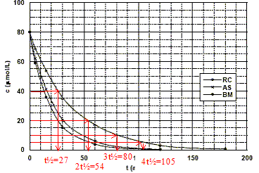 Montrons graphiquement, à partir de cette figure, que la réaction est du premier ordre. On prendra le cas du rouge de Congo pour illustrer cette méthode. réaction d'ordre 1 : le temps de demi réaction est indépendant de la concentration ; à chaque t½ la concentration en colorant est divisée par deux.