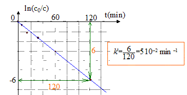 À partir des données du tableau, vérifions par une autre méthode, que cette hypothèse est juste dans le cas du bleu de méthylène : v = k[colorant][O2] = k'[colorant] avec k'= k[O2] si [O2] en excès peut être considéré comme constant. d[colorant]/dt = - k'[colorant] soit après intégration c = c0 exp(-k't) ou bien ln (c0/c) = k't. On trace le graphe ln (c0/c) = f(t) droite de pente k' si l'hypothèse est vérifiée.
