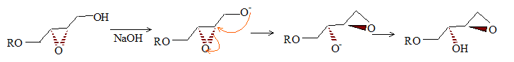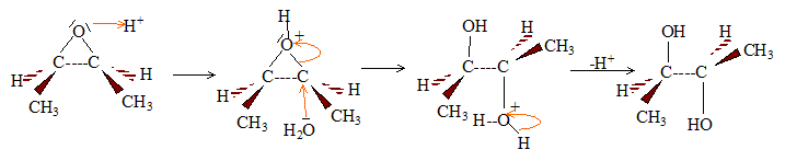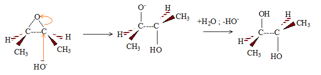 L'attaque initiale de HO- est équiprobable sur chaque carbone : on obtient donc les deux énantiomères dans la même proportion ( mélange racémioque). En milieu acide l'attaque initiale de H+ porte sur l'atome d'oxygène.