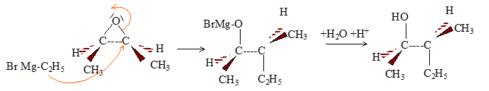 En RMN du proton 1H, ce diol donne trois signaux du fait de la symétrie de la molécule : le signal du proton du groupe OH ( singulet), très déblindé ; le signal des 3 protons du groupe CH3 ( doublet), le moins déblindé ; le signal de l'hydrogène fixé sur le carbone ( quadruplet), déblindé par la présence de l'atome d'oxygène. Par action de l'organomagnésien C2H5-MgBr, suivie d'une hydrolyse, sur un époxyde, on obtient un alcool :