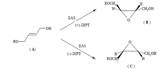 diisopropyle est : Le mécanisme de lépoxydation asymétrique de Sharpless (que lon notera EAS) est complexe : il fait intervenir une association entre le tartrate, le titane, et la fonction alcool de lalcool allylique ; on ne donnera que le résultat (le rendement est significatif dans chaque cas) obtenu à partir du composé (A) représenté ci-dessous :
