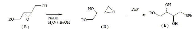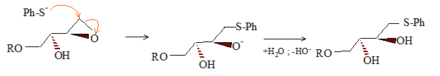 Le stéréoisomère obtenu dépend donc de la nature du DIPT utilisé. La suite est effectuée à partir de (B). Dans la molécule (A), R représente le groupement (C6H5)2CH- que lon pourra noter Ph2CH où Ph est le symbole du noyau benzénique. Nom de A : (E)-6,6-diphényl-5-oxahex-2-én-1-ol. Lhydrolyse du composé (B) est réalisée en milieu basique, et en présence de PhS-, ion phénylthiolate. On a pu mettre en évidence les transformations successives (réarrangement de Payne) :