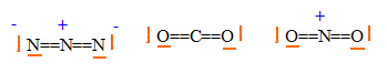 La molécule CO2 et un ion NO2+ sont isoélectroniques de N3-. La structure de Lewis proposée pour N3- ( symétrie par rapport à l'azote central ) est en accord avec la longueur identique des liaisons. Par contre une disymétrie de structure entraîne des longueurs de liaisons différentes ; écrivons les formules mésomères pour l'ion azoture :