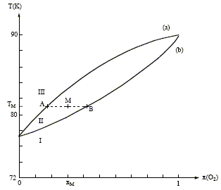 Mélanges binaires idéaux : Microscopiquement la solution se comporte comme un liquide pur : les interactions entre molécules différentes et molécules identiques sont égales. Il faut pour cela que les molécules soient assez semblables ( exemple O2 et N2). On observe un diagramme en fuseau ou diagramme isotherme idéal pour des liquides totalement miscibles. Phases en présence dans les domaines I, II, III : à pression constante, quand la température s'élève, on passe de l'état liquide à l'état vapeur. donc : I : liquide ; II : liquide et vapeur en équilibre ; III : vapeur courbe a : courbe de rosée, ensemble des points où apparaît la première goutte de liquide lorsqu'on refroidit de la vapeur. courbe b : courbe de