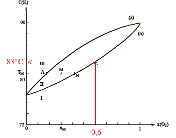 Distillation fractionnée de l'air liquide : Le changement d'état des mélanges binaires O2 - N2 s'étudie grâce au diagramme isobare ( P= 1 bar) d'équilibre liquide-vapeur suivant :