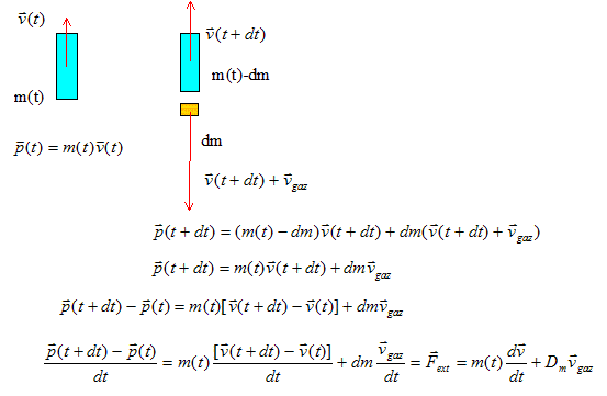 Expression de la force propulsive F : En dt seconde, une masse dm de gaz est éjecté à la vitesse vgaz ; la masse de la fusée devient m-dm ; la vitesse de la fusée est notée v.