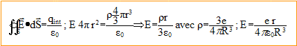 L'atome d'hydrogène n'est soumis à aucune action extérieure. On s'intéresse à l'oscillation libre de l'électron par rapport à la sphère de centre O. On admet que l'électron ne perd pas d'énergie par rayonnement. Les vecteurs sont écrits en gras et en bleu. A l'instant t, l'électron est en M tel que OM= r = r er ( r<= R). L'électron de l'atome d'hydrogène se déplace dans le champ électrostatique du proton représenté par une distribution volumique de charges uniforme de rayon R. densité de charge volumique : r = charge / volume de la sphère de rayon R ; r = e / (4/3pR3) = 3e/ (4pR3). L'électron n'est soumis qu'au champ électrique crée par une distribution volumique représentant le proton. Ce champ est radial. Appliquons le théorème de Gauss à une sphère de centre O (centre de l'atome), de rayon r <R.