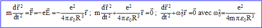 A l'instant t=0, l'électron est écarté de sa position d'équilibre par une perturbation quelconque. Nature du mouvement : Il est alors soumis à la force centrale F=-e E = -e2/(4pe0R3) r . Le référentiel d'étude étant galiléen : La dérivée par rapport au temps du moment
