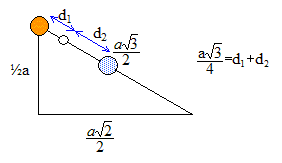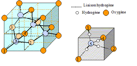 Les atomes d'oxygène forment une structure de type diamant. Les atomes d'hydrogène s'alignent entre les atomes d'oxygène les plus proches. La distance d1 la plus courte ente un atome d'oxygène et un atome d'hydrogène est 100 pm. On note d2 la distance la plus longue. Le paramètre de maille, noté a, vaut 637 pm. La structure de type diamant est une maille cubique à face centrée avec occupation de la moitié des sites tétraèdriques de façon alternée. Représentation de la maille élémentaire :