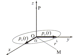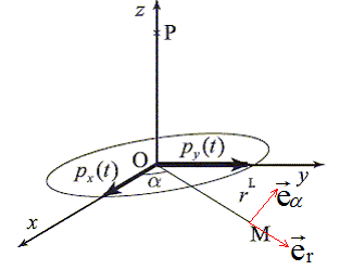 L'atome d'hydrogène est considéré comme un double dipôle oscillant appliqué en O : px=p0cos(wt) ; py=p0sin(wt). Il rayonne un champ électromagnétique.