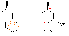 Le citronellal est schématisé par R-CH=C((CH3)2 L'étape 1, formation du carbocation le plus stable, est cinétiquement la plus lente : elle est déterminante. La règle de Markovnikov permet de prévoir sur quel atome de carbone se fixe l'hydrogène de l'hydracide ( ou de H2O) : l'atome d'hydrogène se fixe sur l'atome de carbone le moins substitué ( formation du carbocation le plus stable )