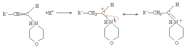 prévisibles. Dans le cas de l'action d'une amine secondaire sur un aldéhyde ou d'une cétone, la déshydratation du produit intermédiaire d'addition obtenu fait intervenir la mobilité des atomes d'hydrogène portés par un carbone en a du carbonyle et conduit à une énamine. Le citronellal sera noté R'-CH2-CHO. En milieu acide l'énamine se protone sur l'un des deux atomes de carbone doublement lié. La forme protonée est stabilisée par résonance. L'hydrolyse de l'énamine en milieu acide en présence d'un large excès d'eau régénère le carbonyle et donne la forme protonée de la morpholine |