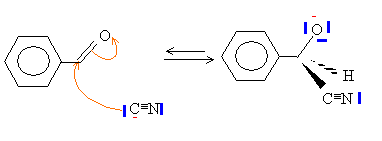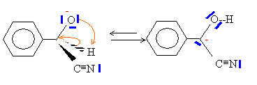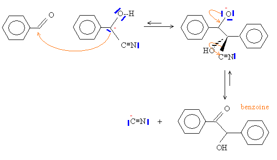 L'anion obtenu subit une prototropie qui conduit réversiblement à un carbanion stabilisé par résonance avec le noyau benzénique et la fonction nitrile. Le mécanisme se poursuit par une addition nucléophile de ce carbanion sur une autre molécule de benzaldehyde, puis, après une réaction acide base intramoléculaire, par élimination de l'ion cyanure dans la dernière étape qui conduit à la benzoïne.