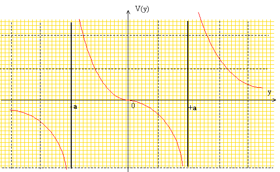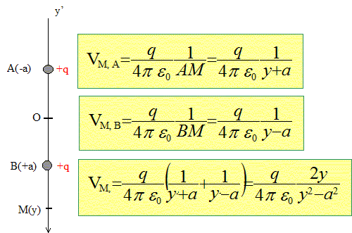 Deux charges ponctuelles positives q sont placées sur un axe y'Oy aux ordonnées -a et +a . Déterminer le potentiel V(y) et le champ électrique E (y) en tout point de l'axe y'Oy.
