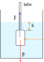 Le densimètre est en équilibre sous l'action de deux forces opposées, son poids P=mg et la poussée d'Archimède F, de valeur égale au poids de volume de liquide déplacé. Volume de liquide déplacé = volume du réservoir + volume de la tige cylindrique de hauteur h V= V1+pd2/4 h Poussée F= Vgr ; poids P=mg d'où : Vr = m ; V1+pd2/4 h = m/r ; pd2/4 h = m/r - V1 h = 4(m/r - V1) / (pd2) avec m = 5,11 10-2 kg ; V1=4,8 10-5 m3 ; d = 4 10-3 m h = 4(5,11 10-2/ 1000-4,8 10-5) / (3,14 *16 10-6)=0,247 m.