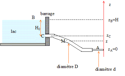 Le niveau du lac est pratiquement constant ; la vitesse de l'eau en B est pratiquement nulle. Notations : p0 : pression atmosphérique ; r : masse volumique de l'eau. Expression de la vitesse de l'eau en A : Relation de Bernoulli : p/r + gz + ½v² = constante. g représente la valeur du champ de pesanteur terrestre. Cette relation peut être applicable à tout le fluide si : le fluide est incompressible (r constant), "parfait" ( viscosité nulle), en régime permanent et sans transfert de chaleur. Appliquer cette relation entre A et B : état A : pression p0 ( à la sortie du petit tube, l'eau est en contact avec l'air ); altitude nulle, vitesse vA. état B : pression p0 ; altitude H, vitesse nulle. d'où p0 /r +gH +0 = p0 /r + 0 + ½v²A ; vA = (2gH)½. vitesse et pression en M : le débit volumique est constant : débit ( m3/s) = section (m2) * vitesse m/s) pD²/4 vM = pd²/4 vA ; D² vM = d² vA ; vM =(d/D)2vA. Appliquer la relation de Bernoulli entre B et M : état M : pression pM ; altitude z, vitesse vM. état B : pression p0 ; altitude H, vitesse nulle. d'où p0 /r +gH +0 = pM /r +gz + ½v²M . p0 +gHr = pM +gz r + ½rv²M . pM = p0 +g(H-z)r- ½rv²M ; pM = p0 +g(H-z)r- ½r(d/D)4v²A. pression en C : altitude du point C : zC= H-H0 ; d'où H-zC= H0 ; pC = p0 +gH0r- ½r(d/D)4v²A. Or H0 < H-z en conséquence pC < pM valeur minimale de d telle que la pression dans la conduite soit toujours supérieure à une valeur pmini : La pression est la plus faible en C d'où : pmini > p0 +gH0r- ½r(d/D)4v²A. pmini - p0 > gH0r- ½r(d/D)4v²A avec v²A = 2gH pmini - p0 > gH0r- rgH(d/D)4 ; (pmini - p0) / (rgH ) >H0 / H - (d/D)4 ; (d/D)4 > H0 / H + (pmini - p0) / (rgH ) d > D[H0 / H + (pmini - p0) / (rgH )]1/4.