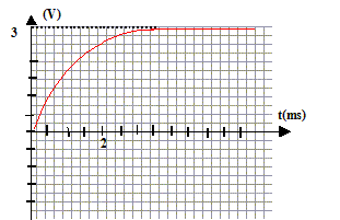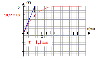 Intersection de l'asymptote horizontale avec la tangente à l'origine : l'abscisse de ce point donne RC. ou bien à t =RC, la tension aux bornes du condensateur vaut 63% de sa valeur maximale. L'abscisse de ce point donne RC. RC= 1,1 ms = 1,1 10-3 s. Sachant que R = 1000 W, valeur de C : 1,1 10-3 / 1000 = 1,1 10-6 F = 1,1 mF.