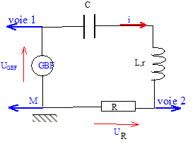 Comme dans la partie A, on visualise sur l'écran d'un ordinateur, la tension aux bornes du générateur basse fréquence (uGBF) et du conducteur ohmique de résistance R (uR) . On réalise le montage suivant avec la bobine L, de résistance r, le condensateur C, et la résistance R en série avec le GBF.